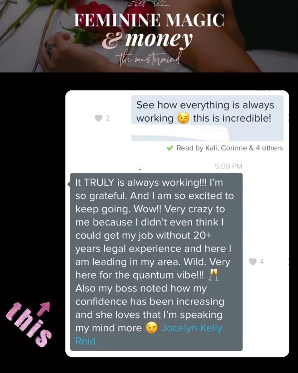 “Working with Jocelyn in Feminine Magic & Money has been so incredible. I love Jocelyn's work around money as it is fun, sexy, and incredibly healing. I am working to dissolve the feast or famine pattern in my finances and this program has been an answer to my prayers. Before we began, I was totally burnt out in my business and it was affecting my marriage and my motherhood. I felt like I didn't have the energy for anything. After only 4 weeks in the container, I have had $11,500 in sales, I feel nurtured in my life and reconnected to my beautiful family. The content is high caliber and the support is worth its weight in gold plus interest. It's fabulous to be connected to such high-caliber women and to be guided by a women's woman, who truly lives what she teaches. Thank you Jocelyn for this beautiful opportunity and the endless gifts that I have received from this program. XO.